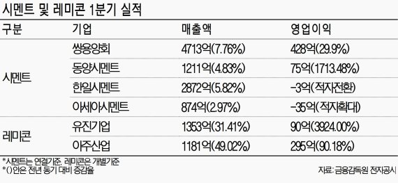 반면 시멘트 업체들의 실적은 엇갈렸다. 시멘트 업계 1위인 쌍용양회는 1.4분기에 전년 동기 대비 7.76% 늘어난 4713억원의 매출을 기록했다. 영업이익도 29.9% 증가한 428억원을 달성했다. 동양시멘트는 1211억원의 매출과 75억원의 영업이익을 달성했다.