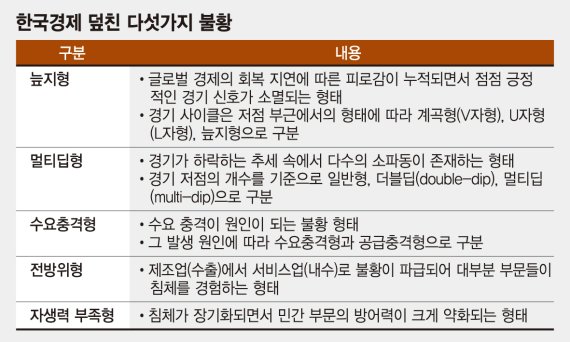 이에 따라 보고서는 최근 우리가 직면하고 있는 불황 국면을 '늪지형' '멀티딥형' '수요충격형' '전방위형' '자생력 부족형' 등 다섯가지 형태로 정리했다.