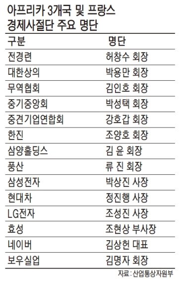 박 대통령의 에티오피아.우간다.케냐 등 아프리카 3개국 및 프랑스 방문에 동행할 경제사절단은 166개 기업.기관으로 꾸려졌다. 한편 산업통상자원부는 이날 허창수 전국경제인연합회 회장, 박용만 대한상공회의소 회장, 조양호 한진 회장, 김윤 삼양사 회장, 류진 풍산 회장 등을 포함한 경제사절단 명단을 발표했다.