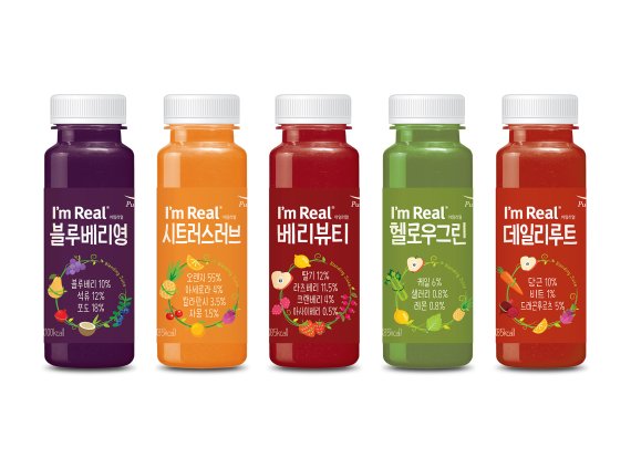 아임리얼 블랜딩 주스 5종은 과일과 채소 섭취가 부족한 현대인들의 라이프스타일을 고려하여 몸에 좋은 채소와 과일을 배합한 것이 특징이다. 전 제품 모두 5가지 이상의 과일과 채소의 장점을 모아 영양을 높였으며, 최적의 배합을 통해 특별한 맛을 냈다. 끓이거나 농축하지 않고 지긋이 눌러 짜내는 콜드프레스(Cold-Pressed) 방식으로 자연 그대로의 풍미를 느낄 수 있다.