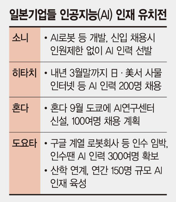 전 세계적으로 '인공지능(AI) 인력 유치 전쟁'이 벌어지고 있다. AI 연구개발(R&D), 기술인력 품귀 현상이다. 현재 전 세계적으로 AI 전문가가 수만명 부족한 것으로 추산된다. AI 전문가들의 몸값도 껑충 뛰었다. 이런 상황에서 도요타, 소니 등 일본 기업들이 AI 인력 채용에 가장 적극적이다.