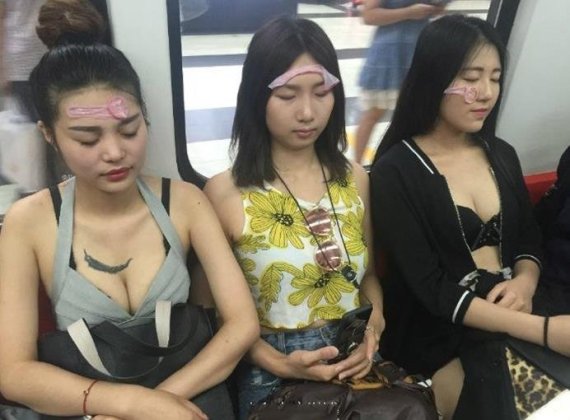 혼잡한 출퇴근 시간 태연하게 얼굴에 콘돔을 붙이고 있는 여성들의 모습에 시민들은 눈살을 찌푸렸다.