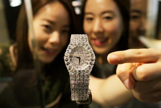 모델들이 갤러리아 명품관에서 17억원 짜리 피아제의 '라임라이트 익셉셔널 아우라 화이트 골드워치'를 선보이고 있다.