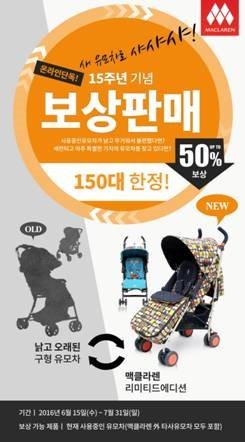 보상판매 대상은 맥클라렌을 비롯해 타사 브랜드, 유모차 모델, 연식에 상관없이 유모차 소유 고객이라면 누구나 참여 가능하다. 이벤트 참여는 맥클라렌 공식 커뮤니티에서 보상판매 신청서를 다운 받아 세부 사항을 기재한 후 이메일을 통해 접수하면 된다. 신청서가 접수되면 해당 고객에게 세피앙몰 전용 50% 보상 쿠폰이 발송되며, 쿠폰을 받은 고객은 직접 세피앙몰에 접속하여 제품을 구매할 수 있다. 이벤트는 15일부터 한정수량 소진 시까지 진행된다.