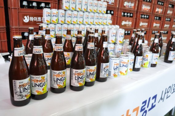 하이트진로는 23일 전주공장에서 주류 과일믹스 신제품인 '하이트 망고링고'(사진)를 출고하고 유통을 시작했다고 밝혔다.