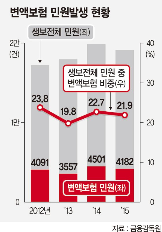 하지만 '납입중지' '중도인출' 등은 자금유동성이 좋다는 부분을 부각해 가입을 유도하기 위한 장치로 이용되는 사례가 많다. 실제 지난 4년간 생명보험 전체 민원에서 변액보험이 차지하는 비율은 평균 20% 이상으로 높은 편이다.