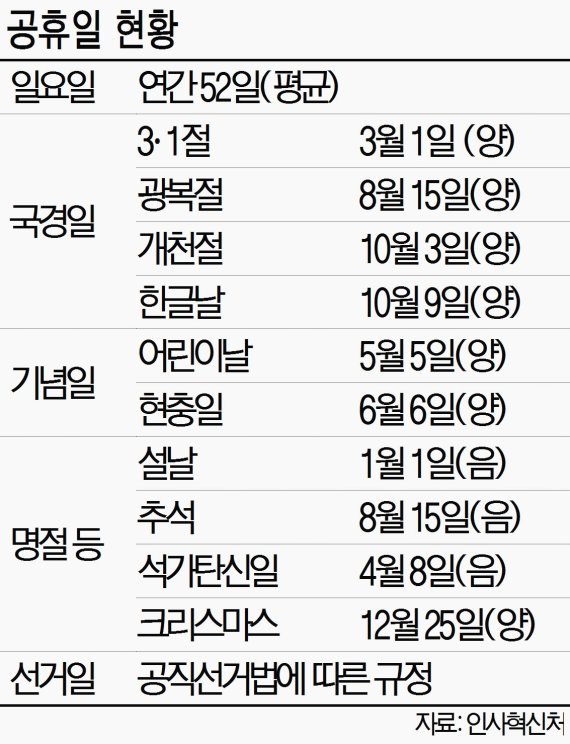 정부는 28일 '하반기 경제정책방향'을 발표하고 업무 효율성 제고, 국민 휴식권 보장, 내수 활성화 등을 위해 요일지정제 도입 등을 포함해 공휴일 제도 전반을 검토하기로 했다. 인사혁신처는 하반기 중 연구용역을 발주해 공휴일 제도 개선안을 마련할 계획이다.