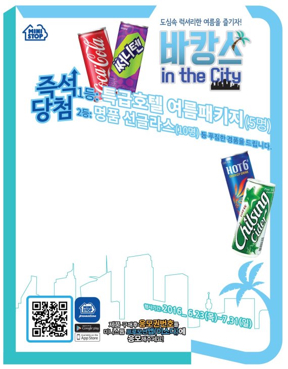 편의점 미니스톱은 7월 31일까지 바캉스 시즌을 맞아 청량음료 26종 구매 고객을 대상으로 응모권 이벤트 '미니스톱, 바캉스 인 더 시티'를 시행한다고 1일 밝혔다. 음료를 구매하고 받은 응모권은 점포 내 판촉물에 안내된 QR코드 또는 미니스톱 전용 이벤트 애플리케이션 '이소다(Esoda)'만 설치하면 응모할 수 있다. 미니스톱에서 코카콜라250ml, 레드불캔, 웰치스캔포도, 핫식스 등 26가지의 청량음료 캔 중 하나를 구매한 고객에게 추첨을 통해 호텔 패키지 상품권, 워터파크 입장권 등 도심에서 즐길 수 있는 바캉스 상품을 경품으로 증정한다.