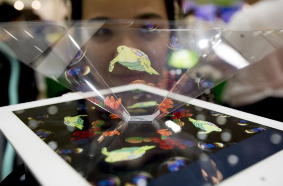 이날 한 참가자가 스마트기기에 홀로그램 기술을 적용한 3D 가상 수족관을 살펴보고 있다.