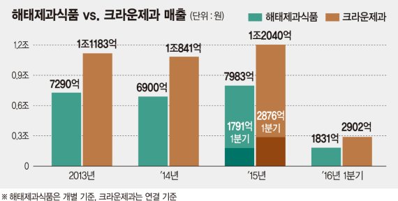 지난해 매출실적 성장률 해태 15.9% 크라운 2.4%