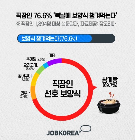취업포털 잡코리아가 초복을 앞두고 직장인 1894명에게 ‘선호 보양식’을 묻는 설문조사를 실시한 결과 이같이 나타났다고 12일 발표했다.