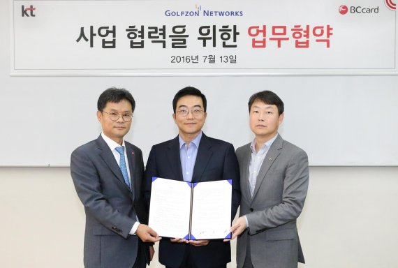 KT는 서울 KT 광화문 웨스트 사옥에서 BC카드, 골프존네트웍스와 각 사의 서비스를 활용한 사업 발굴 및 공동 마케팅 이행을 위한 업무협약(MOU)을 체결했다고 13일 밝혔다.
