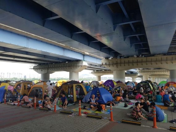 특히 마포대교나 나무그늘 아래 시원한 곳을 골라 텐트·그늘막을 설치해 놓고 음악을 듣거나 잠을 자고 음식을 먹으며 쉬는 모습을 쉽게 찾을 수 있었다. 아이들은 한강공원 내 조성된 물빛광장을 중심으로 모여 물놀이를 하고 있었다.