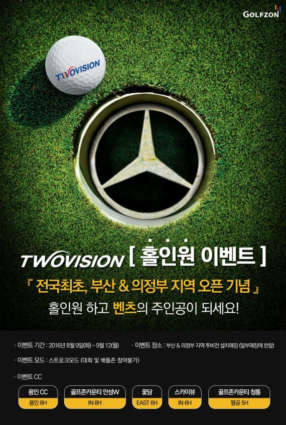 기간은 9일부터 9월 12일까지 5주간이며 가맹사업 시범운영 지역으로 선정된 부산광역시 전지역과 경기도 의정부시에서 실시된다. 이번 홀인원 이벤트는 이들 지역 투비전이 설치된 일부 매장에서 참여 가능하다. 스트로크 모드의 용인CC 용인코스 8번홀, 골프존카운티 안성W IN코스 8번홀, 꽃담 EAST코스 6번홀, 스카이뷰 IN코스 6번홀, 그리고 골프존카운티 청통 팔공코스 5번홀 등 5개 CC에서 진행된다.