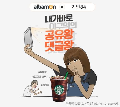 기안84는 네이버 웹툰 ‘복학왕’을 연재하고 있는 웹툰 작가로 ‘무한도전’, ‘나 혼자 산다’ 등 다양한 방송에 출연해 큰 인기를 얻고 있다. 기안84는 지난 7월 알바몬과 ‘특급 콜라보 SNS 이벤트’를 진행해 큰 호응을 얻은 바 있다.