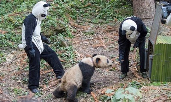 이들은 판다가 인간을 따르지 않도록 흰 몸체에 검은 팔다리, 마스크를 착용해 성인 판다인 것처럼 분장한 뒤 음식이나 물 찾는 법, 집 만드는 법 등을 차근차근 가르치고 있다. 다소 우스워보일 수 있지만 판다들이 미래에 야생에서 도태되지 않고 빠르게 적응할 수 있도록 하기 위한 노력인 셈이다.