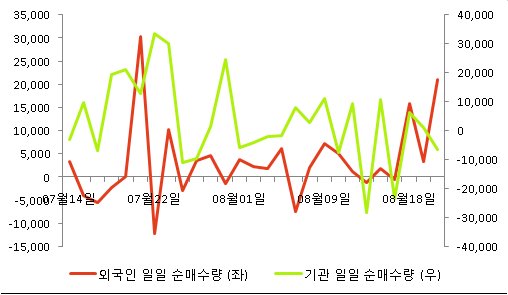 다음 표는 동종목의 외국인, 기관의 일별 순매수량을 나타낸 것이다.