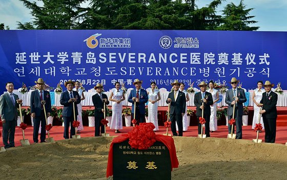 연세의료원은 지난 22일 중국 칭다오시 라오산구 국제생태건강도시구역에서 '칭다오 세브란스 병원' 기공식을 갖고 공사에 착수했다. 현지 부동산개발회사인 신화진그룹과 합자형태로 설립하는 이 병원은 15만5000㎡의 부지에 오는 2020년까지 1단계로 1000병상(최종단계 3000병상) 규모러 건립된다. 윤도흠 의료원장(오른쪽 첫번째)과 류독평 신화진그룹 총재(왼쪽 첫번째)가 첫 삽을 뜨고 있다.
