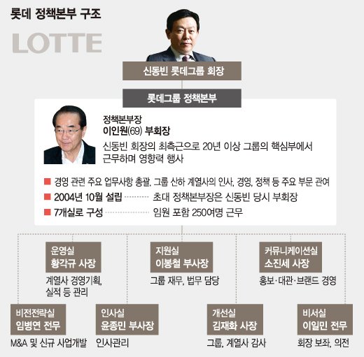 검찰의 소환을 앞두고 26일 스스로 목숨을 끊은 이인원 롯데그룹 부회장(정책본부장)은 황각규 정책본부 운영실장(롯데쇼핑 사장), 소진세 정책본부 대외협력단장과 함께 롯데의 가신 3인방 중 핵심인물이다. 지난 1973년 평직원으로 롯데호텔에 입사해 재계 5위 롯데그룹 부회장 자리에 오른 입지전적인 인물로 롯데그룹 임직원들의 '롤모델'이기도 하다.