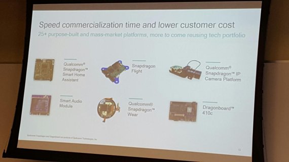 퀄컴의 이그나시오 콘트레라스 마케팅 이사는 "스마트기기를 드론, 스마트홈, 웨어러블 기기, 자동차, IP카메라, 인터넷 동영상서빗(OTT) 등 25개 정도로 분류한 뒤 이 분류별로 맞춤형 스냅드래곤 칩셋 개발을 세분화하고 있다"며 "각각의 개별칩을 하나로 모을 수 있도록 준비하고 있기 때문에 제조사들은 시간과 비용을 절약할 수 있을 것"이라고 강조했다.