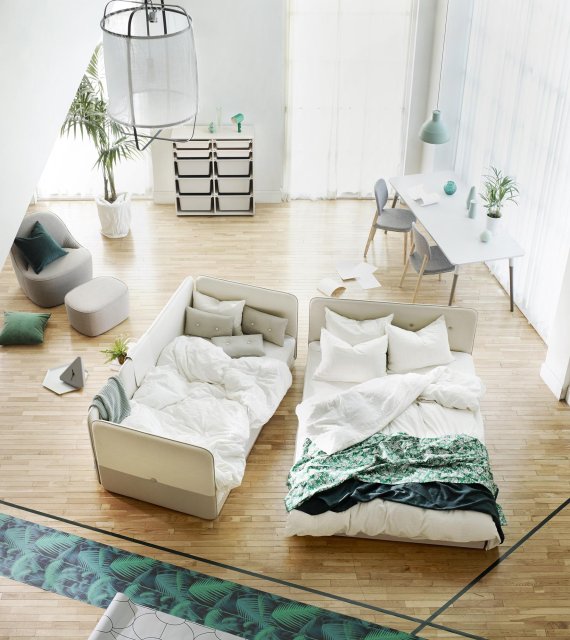 각각의 싱글침대 사이에 협탁이나 높이조절이 가능한 보조테이블을 배치하면 간단한 브런치, 영화감상, 노트북 작업 등 여가 생활을 더욱 간편하게 즐길 수 있다.