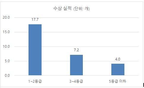 가장 큰 차이를 보인 활동 실적은 수상 실적으로 1~2등급이 17.7건인데 비해 3~4등급은 7.2건, 5등급 이하는 4건으로 나타났다.