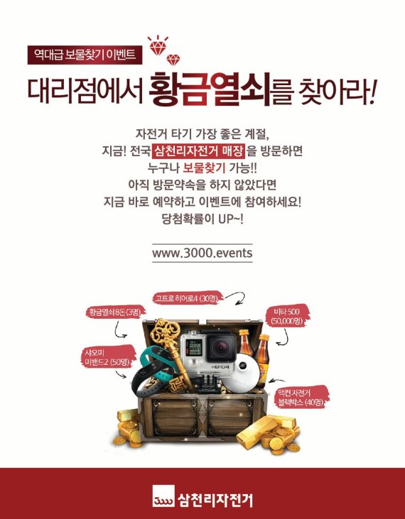 삼천리자전거 관계자는 “라이딩의 계절 가을을 맞아 전국 어디서든 누구나 참여할 수 있는 이벤트를 기획하게 됐다”며 “본인이 거주하는 지역 가까운 매장에 들러 새로운 자전거도 구경하고, 보물찾기 이벤트에도 참여하는 일석이조의 기회를 놓치지 않기 바란다”고 말했다.