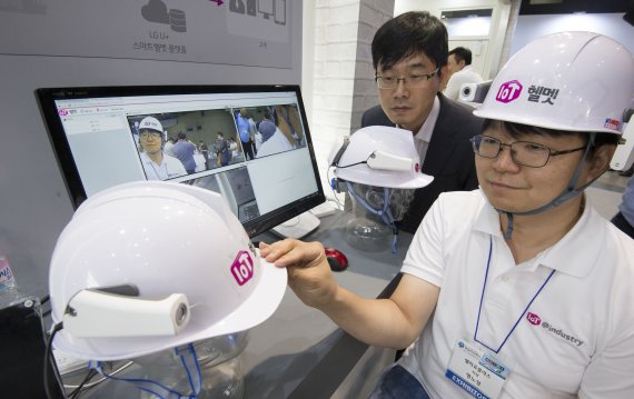 세계 최고 권위의 스마트시티 관련 행사인 '스마트시티 이노베이션 서밋 아시아 2016'이 20일 경기 고양시 킨텍스에서 개막했다. 아시아 최초로 열리는 이번 행사에서 LG유플러스 관계자들이 LTE를 통해 실시간 영상 및 음성 커뮤니케이션이 가능한 산업 안전 IoT 솔루션 'IoT 헬멧'을 시연하고 있다. /사진=박범준 기자