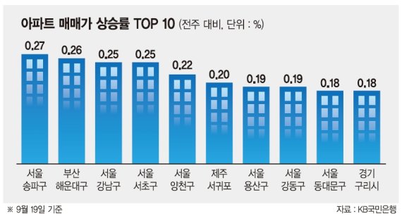 주택시장 가을 성수기에 접어들면서, 강남3구(강남.서초.송파구)의 상승세가 더욱 거세졌다. 전국 매매가 상승률 상위권에서 선두 다툼을 치열하게 벌이고 있다.