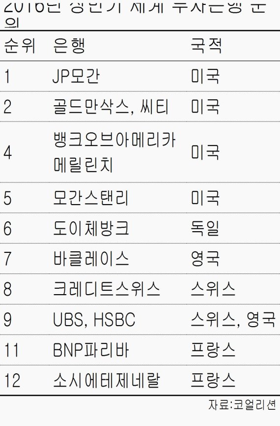 파이낸셜타임스(FT), 비즈니스인사이더 등은 23일(현지시간) 다국적 금융정보 분석업체 코얼리션이 집계한 2016년 상반기 국제 투자은행 순위에서 미국 은행들이 크게 약진했다고 전했다. 전 세계에 걸친 매출액으로 분석한 결과 상반기 1위 은행은 JP모간으로 나타났으며 골드만삭스와 씨티은행은 공동 2위에 올랐다. 뱅크오브아메리카메릴린치와 모간스탠리는 각각 4위와 5위로 기록해 상위 5개 은행이 모두 미국계 은행이었다.
