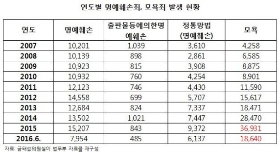 '정보통신망법상 명예훼손죄'도 2007년 3610건에서 지난해 9372건으로 2.6배, '명예훼손죄'는 2007년 1만201건에서 지난해 1만5207건으로 1.5배 늘었다.