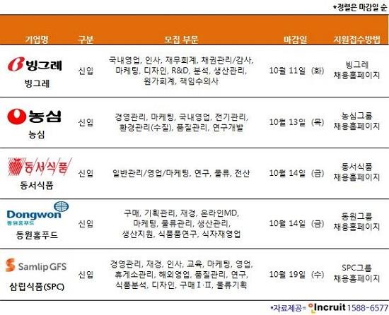 취업포털 인크루트가 10월 중순에 마감되는 식품 관련 대기업 신입 공채 소식을 정리해 7일 발표했다.