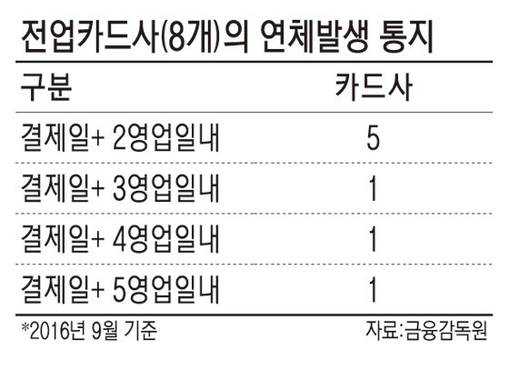 카드사는 정산일에 대금이 결제되지 않으면 문자메시지 등으로 연체사실을 통지하는데 일부 카드사의 경우 '늑장통보'로 불필요한 연체이자가 발생했기 때문이다.