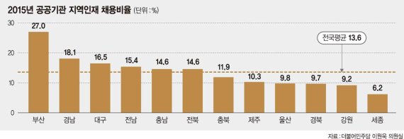 9일 기획재정부의 '2016년 공공기관 인력운영 추진계획'에 따르면 채용인원의 35%를 지역인재로 채용토록 하고 있다. 권고사항인 만큼 공공기관이 35%를 반드시 채워야 하는 것은 아니지만 채용비율이 증가하는 추세다. 비수도권지역 인재는 서울, 인천, 경기를 제외한 지방대 재학생 또는 졸업생이다. 지방으로 이전한 공공기관은 이전한 지역 출신 인재 채용이 권고된다.