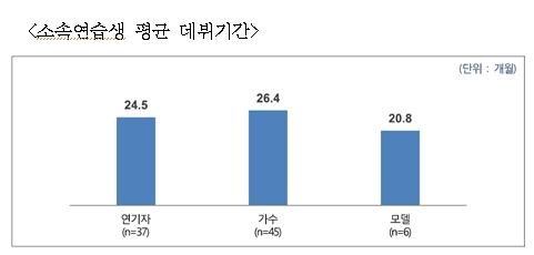 연습생의 평균 데뷔 기간에 대해서는 ‘연기자’의 경우 약 2년(24.5개월), ‘가수’는 약 2년 2개월(26.4개월), ‘모델’은 1년 8개월(20.8개월)로 조사되었다. 이 평균은 자칫 보면 연습생 계약기간 평균보다 짧아서 문제로 보이지 않을 수 있으나, 이는 ‘데뷔’를 한 연습생의 평균이라는 것을 염두에 두어야한다. 연습생 계약은 데뷔를 보장하고 있지 않기 때문에, 실제로 데뷔를 하는 연습생의 비율은 알 수 없다.