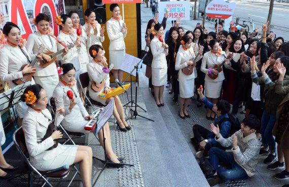 애경그룹 계열의 제주항공은 12일 기내에서 악기 연주서비스를 제공하는 '딴따라팀' 소속 객실 승무원들이 서울 홍대입구역 복합쇼핑몰 '와이즈파크' 앞에서 마카오 신규취항을 알리는 거리공연을 펼쳤다고 밝혔다. 제주항공은 오는 30일 '축제의 도시' 마카오에 취항할 예정이다. 딴따라팀이 거리공연을 펼치고 있다. 사진= 서동일 기자