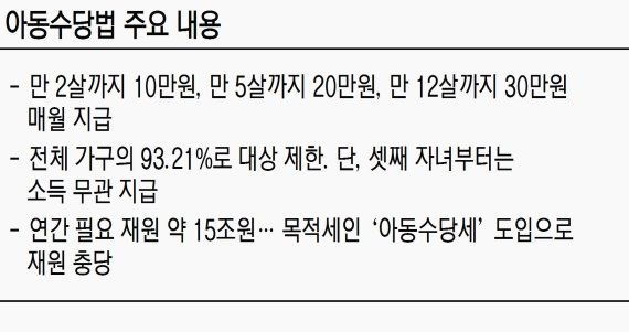 16일 정치권에 따르면 '아동수당법'은 만 12세까지 매월 최대 30만 원을 지급하는 내용을 골자로 한다.
