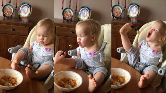바실리나가 손 대신 두 발로 포크를 집고 음식을 먹으려 노력하는 모습이다. 물론 한 번에 성공하지는 못한다. 하지만 바실리나는 포기하지 않고 다시 한 번 도전해 결국 스스로 음식을 먹는데 성공한다.