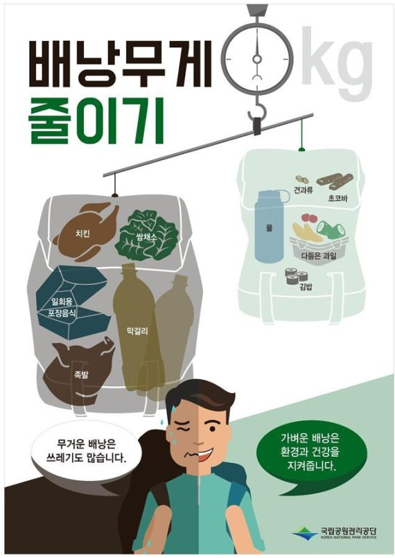 공원공단 관계자는 “먹는 위주의 배낭은 무거울 수밖에 없고 쓰레기 또한 많이 발생하기 때문에 배낭 무게를 줄이면 쓰레기를 줄이고 더불어 건강과 안전도 지킬 수 있다”고 설명했다.