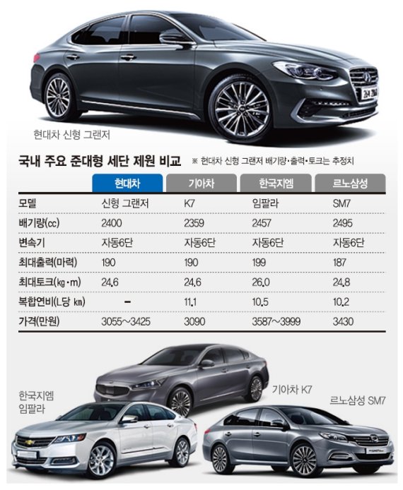 전반적으로 신형 그랜저는 안전.편의사양이 강화되고, 가격경쟁력은 높아져 준대형 세단 지존의 자존심 회복에 속도를 낼 것으로 예상되고 있다.