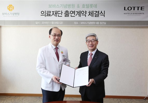 호텔롯데는 4일 오전 보바스기념병원을 운영하는 늘푸른의료재단 인수를 위한 본 계약(출연 계약)을 체결했다.