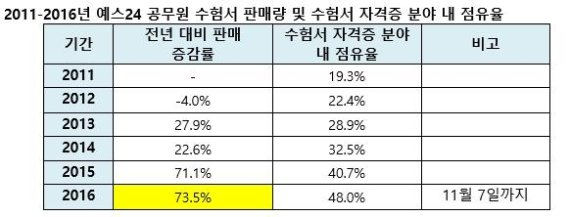 예스24가 최근 5년 공무원 수험서 판매량을 분석한 결과, 2013년부터 전년대비 27.9%의 성장세를 나타낸 이후 2015년까지 꾸준한 성장세를 보이다 2016년에는 11월 7일까지 판매량이 2015년 한 해 판매량을 넘어서며 판매량이 급증했다.