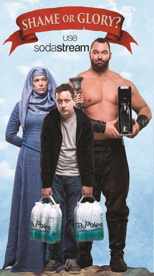 미국 드라마 '왕좌의 게임'의 수치의 행진 장면을 패러디 한 이번 광고 캠페인은 한 남성이 물이 담긴 플라스틱 병을 가득 사는 순간부터 수녀(셉타)로부터 '셰임(shame/수치심)'의 외침을 들으며 걷는 내내 거리에서 사람들에게 조롱당하고 오물을 맞는 등의 장면을 연출했다. 이를 통해 플라스틱 병 구입이 지구 환경에 부끄러운 행위라는 메시지를 담았다는게 업체측 설명이다. 이번 광고 영상에는 '왕좌의 게임' 출연진과 소다스트림 CEO, 임직원 등이 함께 출현해 눈길을 끌고 있다.