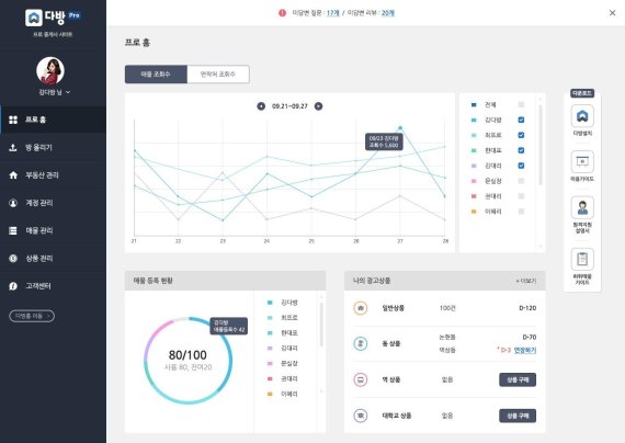 다방의 파트너 공인중개사 전용 사이트 '다방프로'에는 공인중개사무소 운영에 실질적으로 도움이 될만한 정보가 담겨있다. 이번 다방프로를 통해 다방을 사용하는 공인중개사는 메인 화면에서 다방의 광고 효과를 주기 별로 분석하고, 매물 등록현황, 광고 상품 이용현황을 한 번에 볼 수 있게 돼 효율적인 매물 광고를 진행할 수 있다. 또한 중개사무소의 직원 별 매물 등록 현황과 광고 효과를 비교할 수 있는 메뉴도 제공해 소속 공인중개사와 중개보조원 등의 직원 관리도 가능하다. 더불어 기존 다방 사이트에서 제공했던 매물 등록 및 관리, 실시간 질문답변, 부동산 리뷰 관리 등의 기능들이 직관적인 디자인으로 개선되어 고연령대의 공인중개사들도 쉽게 이용할 수 있게 됐으며, 공인중개사별로 다방 전담 매니저가 배정돼 개별 광고 효과 통계 분석 보고서 및 컨설팅을 제공할 계획이다.
