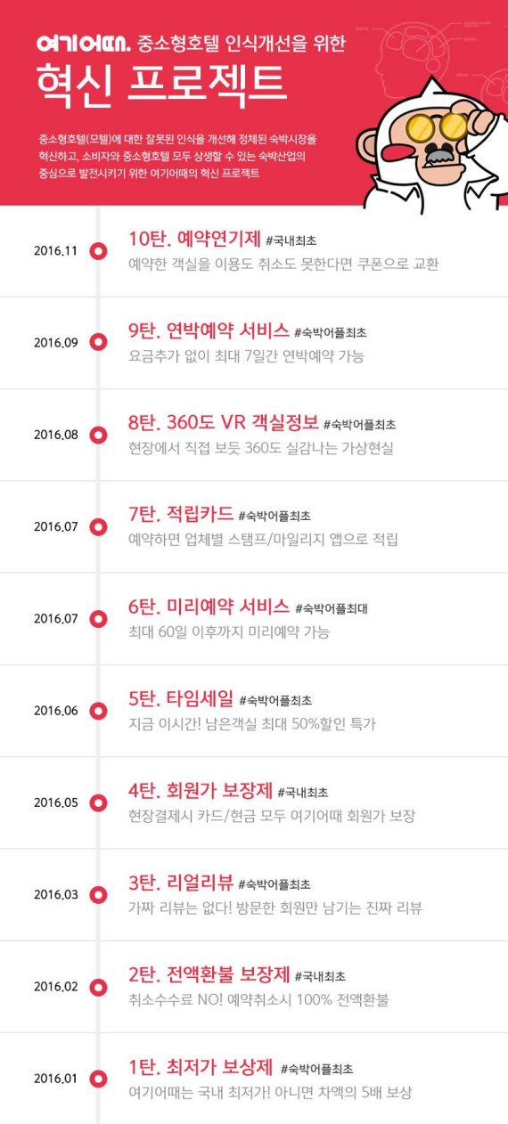 여기어때는 10번째 중소형호텔 인식개선을 위한 혁신프로젝트인 '예약연기제'를 도입한다고 24일 밝혔다. 혁신프로젝트는 중소형호텔에 대한 잘못된 인식을 개선해 정체된 숙박시장을 혁신하고 중소형호텔을 숙박산업의 중심으로 발전시키기 위해 지난 1월 시작됐다. '예약연기제'는 고객이 갑작스런 사정으로 예약 숙소를 방문 못하는 경우, 입실 3시간 이내 즉, 예약취소가 안되는 시간대일 때 예약금을 손해 보는 문제를 해소하기 위해 시행됐다. 숙박 제휴점은 예약이 '노쇼'로 인식되고, 고객은 숙소를 이용하지 못한 데다 예약금도 날리는 문제를 완벽히 해결한 제도다.