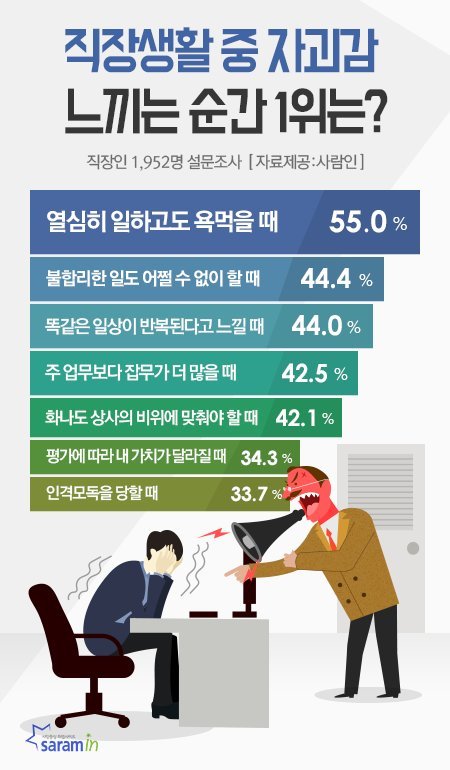 취업포털 사람인이 직장인 1952명을 대상으로 ‘직장생활 중 자괴감을 느낀 경험’에 대해 조사한 결과, 93.3%가 ‘있다’라고 응답했다. 직장생활을 하며 자괴감을 느낀 순간으로는 ▲ ‘열심히 일하고도 욕먹을 때’(55%, 복수응답)를 첫 번째로 꼽았다. 다음으로 ▲ ‘불합리한 일도 어쩔 수 없이 할 때’(44.4%), ▲ ‘똑같은 일상이 반복된다고 느낄 때’(44%), ▲ ‘주 업무보다 잡무가 더 많을 때’(42.5%), ▲ ‘화가 나도 상사의 비위에 맞춰야 할 때’(42.1%), ▲ ‘남의 평가에 따라 내 가치가 달라질 때’(34.3%), ▲ ‘인격모독을 당할 때’(33.7%), ▲ ‘주말도 반납하고 일에 매달릴 때’(28.1%), ▲ ‘자신의 역량이 부족해 성과가 안 나올 때’(26.9%), ▲ ‘성과를 빼앗길 때’(16.6%), ▲ ‘상사의 개인적 심부름을 할 때’(16.4%) 등이 있었다.