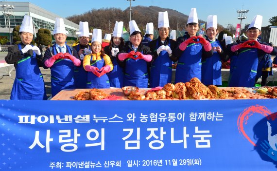 파이낸셜뉴스 신우회 주최로 29일 서울 청계산로 농협 하나로클럽 양재점에서 열린 '사랑의 김장 나눔' 행사에서 권성철 파이낸셜뉴스 사장(오른쪽 네번째)을 비롯한 임직원들과 신우회원들이 김장김치를 버무린 후 기념촬영 하고 있다./사진=서동일 기자