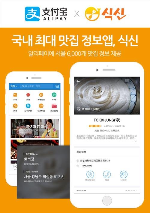 국내 최대 외식업 O2O 플랫폼기업 식신은 알리페이와 제휴를 맺고 알리페이앱에 식신이 보유한 서울 6000여 개 맛집 정보를 제공한다고 11월30일 밝혔다.