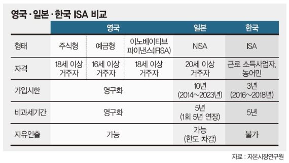 국민 재테크를 위해 올해 3월 도입한 개인종합자산관리계좌(ISA) 가입자격 등 추가 개선이 필요한 것으로 나타났다. 특히 영국이나 일본처럼 까다로운 규제를 풀고 가입대상 등을 확대해야 한다는 지적이다. 1일 금융투자협회와 자본시장연구원에 따르면 영국, 일본 등 ISA 제도를 이어받은 한국도 추가적인 개선책 마련이 필요하다는 지적이다. 이에따라 김종석 새누리당 의원이 ISA가입조건을 완화해 '60세 이상이면 누구나' 가입할 수 있고 중도인출도 허용하는 '신 ISA'가 나올 수 있게 조세특례제한법 개정안을 발의할 예정이다. 또 금융투자협회는 어린이가 가입할 수 있는 주니어 ISA를 추진하고 있다.
