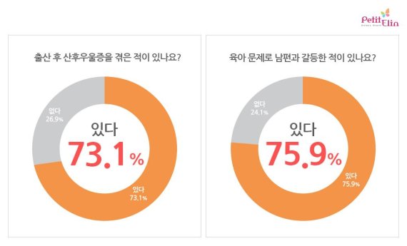 또 육아맘 중 75.9%는 육아 문제로 남편과 갈등을 겪었다고 답했으며, '남편이 감정적, 정서적으로 위로해 주는 부분이 부족한 것 같아서(30.6%)', '육아는 아내 담당이라고만 생각하는 것 같아서(25.5%)' 등이 갈등의 주된 이유로 나타났다.